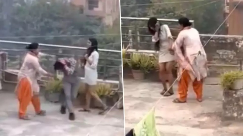 A video on social media shows a mother confronting her daughter and her boyfriend after discovering them together on the rooftop. Filmed from a neighbouring terrace, the footage captures the mother locating the hidden boyfriend with assistance from an onlooker, hitting him with her sandal before he manages to flee.