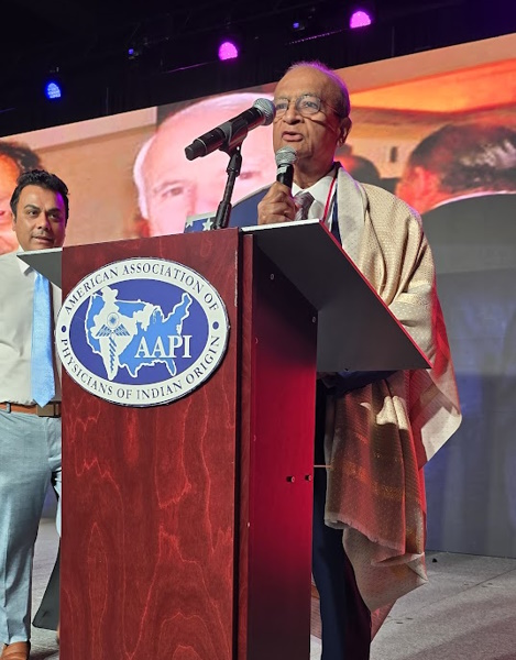 Dr. Bharat Barai, a distinguished Indian American physician and community leader, was honored with the first ever Dr. Sampat Shivangi Legacy Award for his leadership, contributions to the society and close association with Dr. Shivangi, during the 43rd annual American Association of Physicians of Indian Origin (AAPI) Convention in Cincinnati on July 26, 2025.