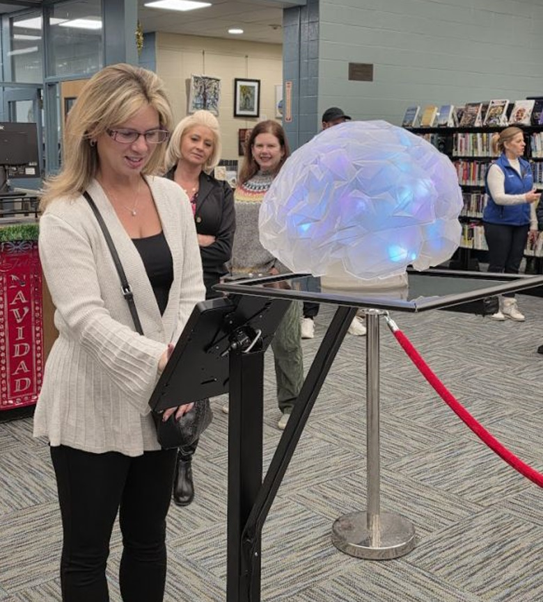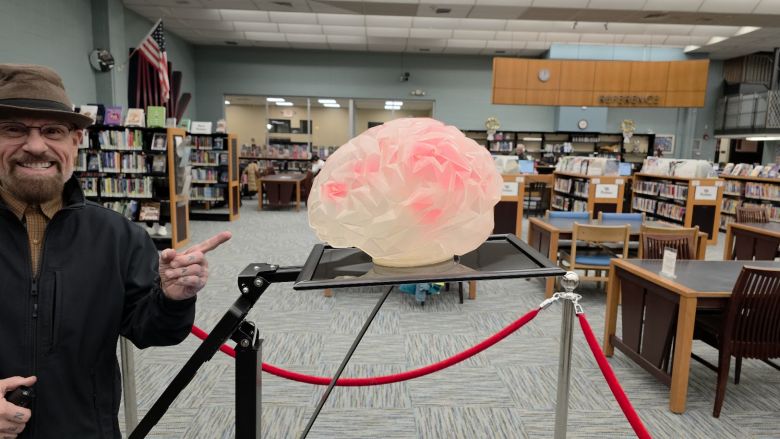 3) Anthony Lombardi, a staff member from the Johnson Public Library, points to the brain exhibited in ‘Mind Your Feelings’.